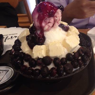 “Bingsu” หรือ “น้ำแข็งไส” แบบเกาหลีนั่นเอง ซึ่งเสิร์ฟในรูปแบบที่แตกต่างจากน้ำแข็งไสบ้านเราตรงที่ใส่เครื่องเยอะ” และเนื้อสัมผัสน้ำแข็งไสละเอียดละเมียดละไมมากค่ะ ตักเข้าปากแล้วละลายทันทีเลยแหละ อีกทั้งยังมีท็อปปิ้งให้เลือกมากมาย เช่น มะม่วง, เมล่อน, สตรอว์เบอร์รี่, บลูเบอร์รี่ชีส ฯลฯ สาวกคนรักความหวานเย็นพลาดไม่ได้เลยนะจ๊ะ ขอบอก